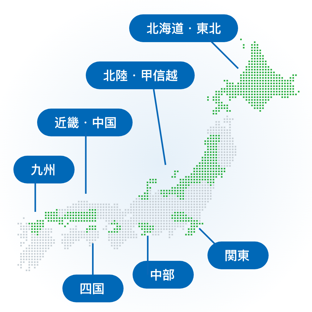 私たちは、北は北海道から南は九州の福岡までと広範囲で、一緒に働ける仲間を募集しています。住み慣れた場所や働きたい場所に合わせて、全国の求人情報をご確認ください。