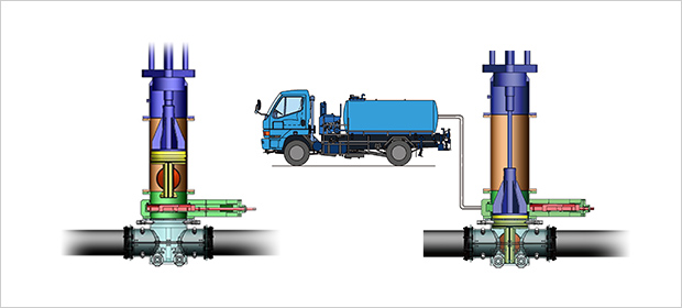 断水せずに既設管の分岐やプラグ・バルブ等の挿入を行う工法です。弊社は多様なニーズに対応できる工法を開発しています。